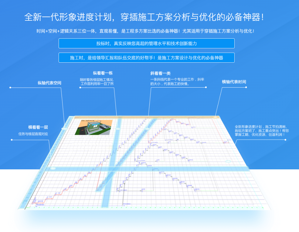 全新形象进度计划横轴依然是时间轴,但纵轴添加了空间的业务涵义,横看看一层、纵看看一栋、斜看看一类;投标时,真实反映您高超的管理水平和技术创新能力!施工时,是给领导汇报和队伍交底的好帮手!