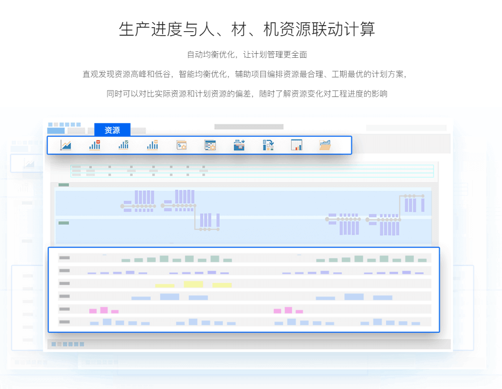 生产进度与人、材、机资源联动计算自动均衡优化,让计划管理更全面直观发现资源高峰和低谷,智能均衡优化,辅助项目编排资源最合理、工期最优的计划方案,同时可以对比实际资源和计划资源的偏差,随时了解资源变化对工程进度的影响 |
