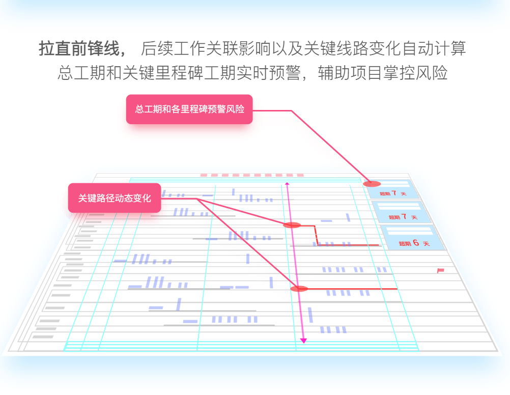 拉直前锋线,后续工作关联影响以及关键线路变化自动计算拉直前锋线,后续工作关联影响以及关键线路变化自动计算 总工期和关键里程碑工期实时预警,辅助项目掌控风险 |