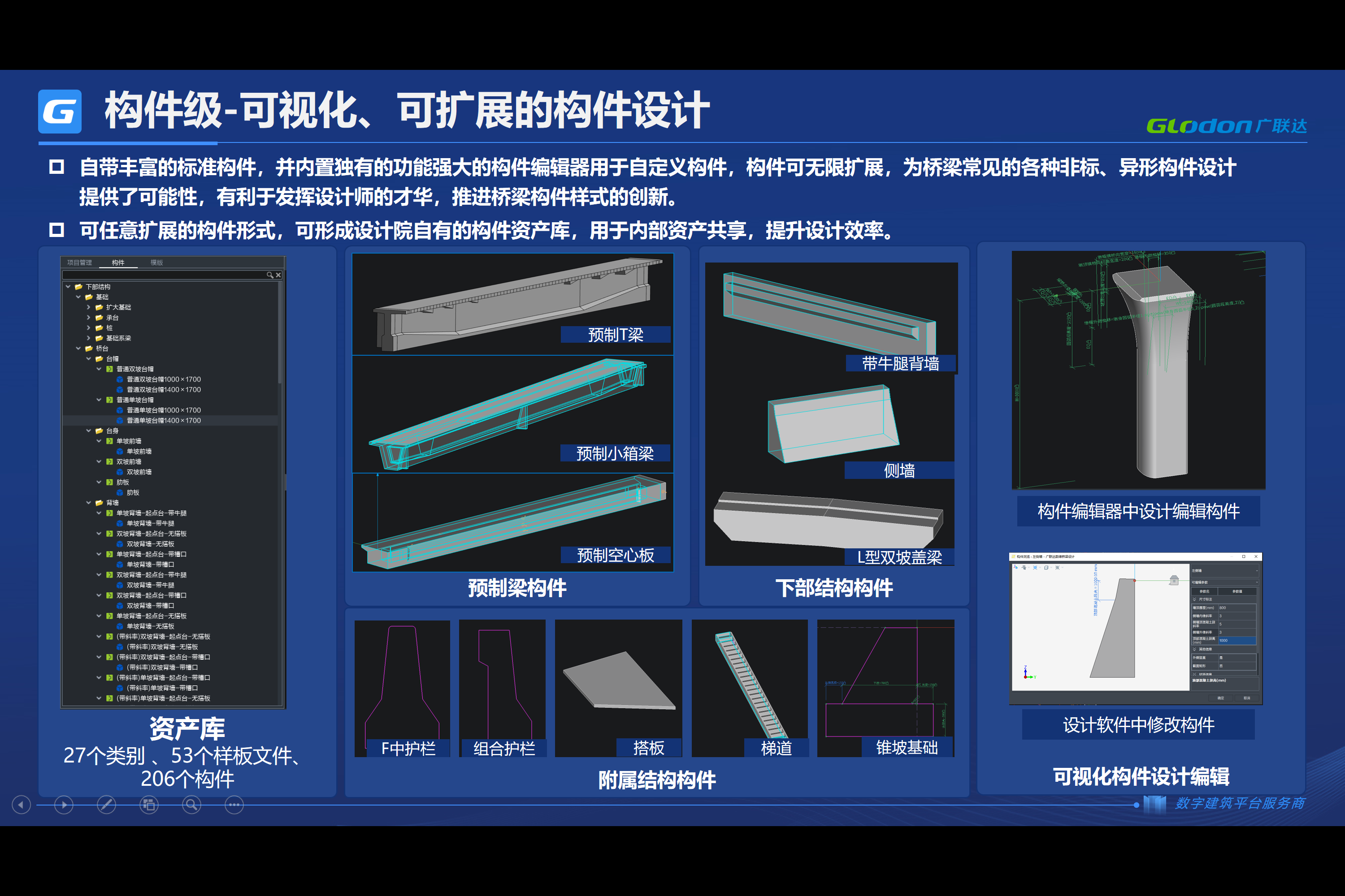 1、构件资产库 2、上下部结构模板库 3、设计规则库