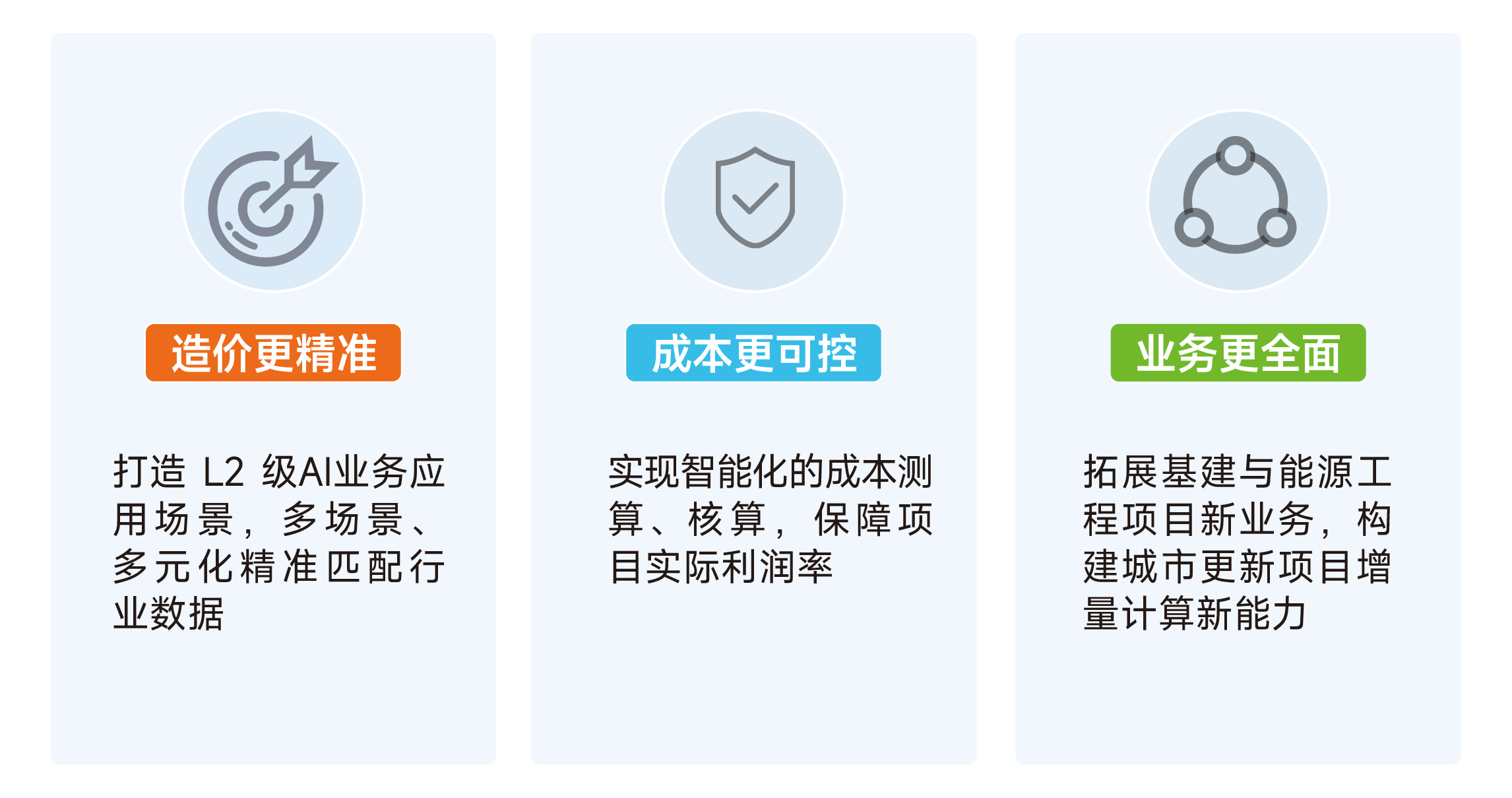 太阳成tyc7111cc以AI技术为核心,结合海量行业数据,构建起智能化的造价成本管理体系,实现从“经验驱动”到“数据驱动”的跃迁式升级。三个方向升级服务能力,一方面把更多行业数据碎片化加持到造价工具的场景中,让造价作业的更多小场景变得智能精准,另一方面提供轻量化成本作业工具,改善繁重管理系统在精细化成本管理中的落地问题,同时在拓展房建领域的城市更新以外,对水利水电、石油石化、电力、公路、民航、光伏、地铁、冶金、水工、通信等多行业项目的造价业务提升服务能力