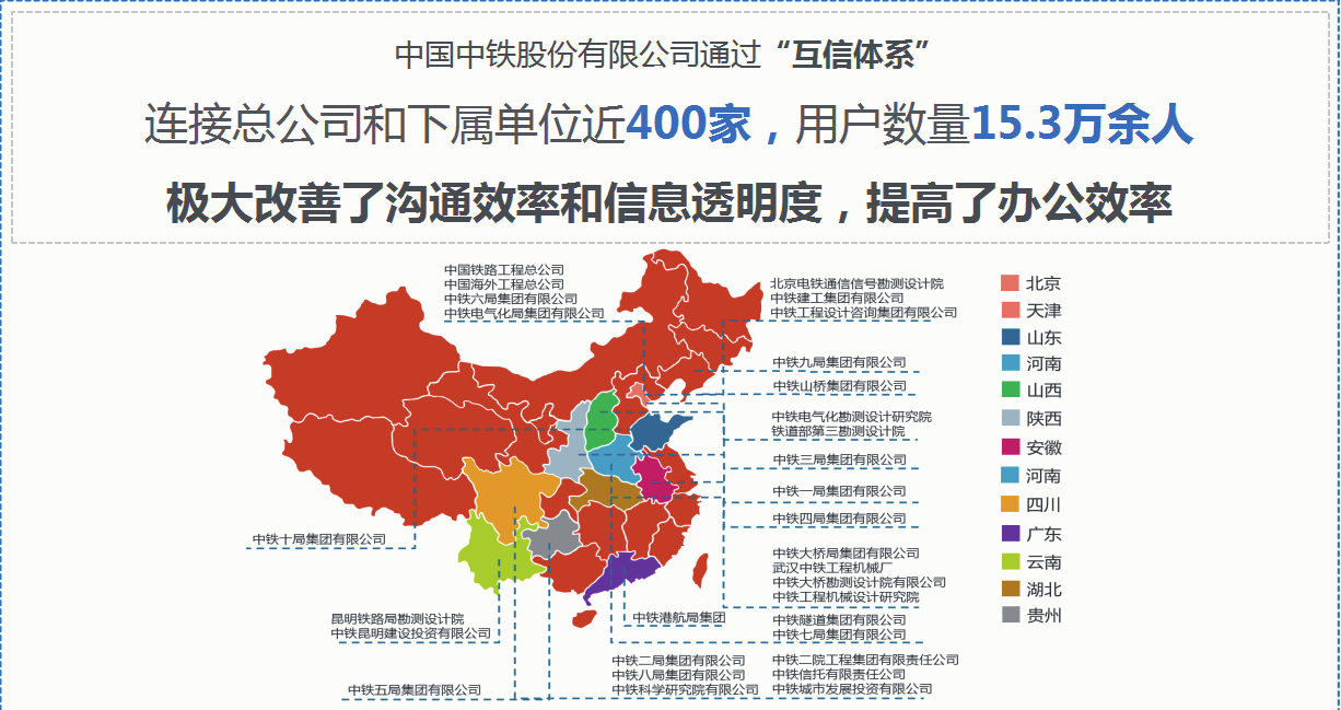 在中国中铁,各级单位都可以建立自己的协同管理平台,进行高度的自我管控,也可通过互信中心机制,把各级单位的平台进行连接,建立全球统一的协同管理平台,实现全网信息互联互通、公文流转;同时结合自身特点,极大改善了沟通效率和信息透明度,提高了办公效率。