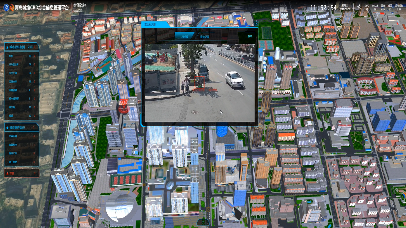 数字城管。综合运用AI+视频技术手段,自动识别中央商务区内道路开挖、车辆违规停放、占道经营、游商小贩、乱堆物料等城管违规行为,基于CIM平台实现城管违规事件告警(含抓拍图片)、核实、任务派发、结果反馈、核验等一系列处置流程。