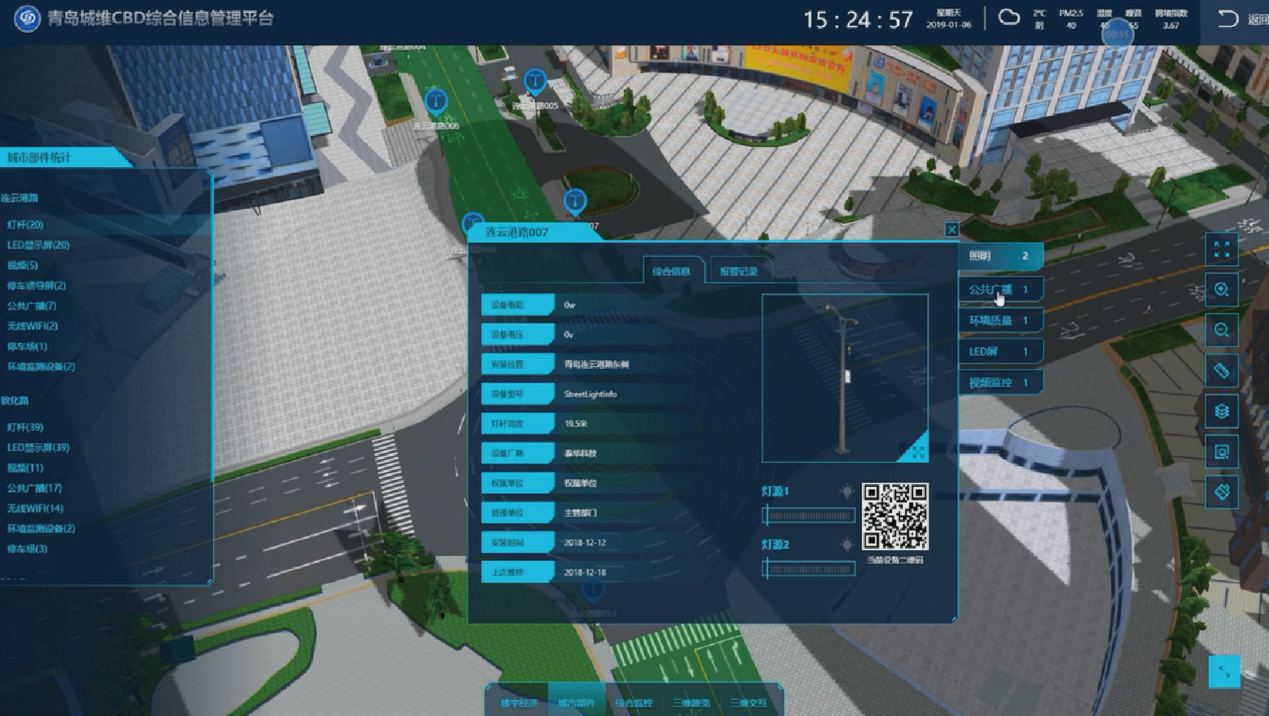 市政部件综合管理。集成商务区智慧多功能灯杆、视频监控、停车诱导等系统,基于CIM平台,实现路灯照明、环境监测设备、视频摄像头、LED多媒体广告屏、停车诱导屏、公共广播等子系统设备的远程在线监测、数据可视化综合呈现、故障报警、超限报警等市政部件综合管理功能。