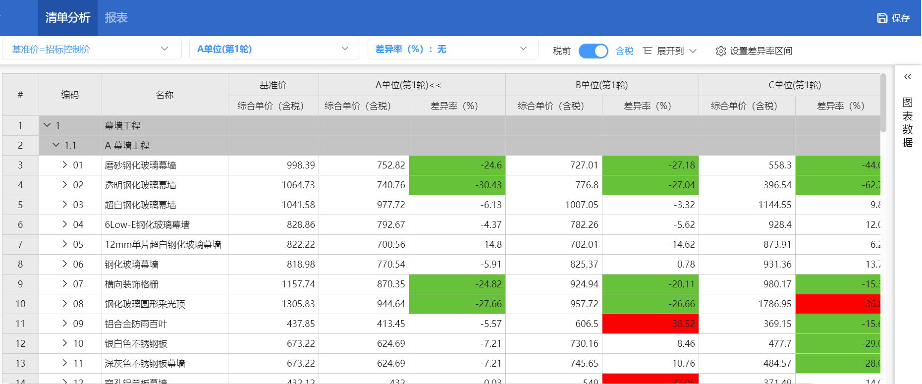简单回标报价秒级分析,各家报价差异详实呈现,清标效率百倍提升。 |